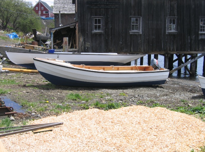 Remember that skiff Jay was working on months ago? Well, at a certain point we had to put it aside to build the dories for the movie production and then we had an order for a Grand Manan dulse dory that had to be ready May 1. However, the skiff, technically a 19.5 foot semi dory similar to the one featured in John Gardner’s The Dory Book, also had a deadline. She had to be ready for the departure of our neighbourhood tall ship, the Picton Castle. She’s slated to cast off on a 12-month voyage around the Atlantic Ocean this week and for the last few days crew members have been painting the new skiff even as Jay completed the finishing touches.