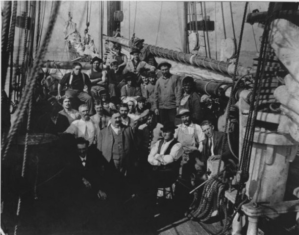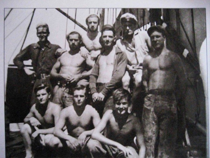 The Starboard Watch: From left to right and up to down, we have: Doug Simmons, Clem Hilts, Kiss The Cod Creaser, Wildman Flower, Larry O’Toole (of the T-wharf O’Tooles), Morten Sileg, Marty Welch, Buddy Greek, 5x5 Zinck, Masher Mosher, Steam Murdock, Rick Nankin, Alan Villiers, Chandler Brown, Steve Christian, Harry Hoback, Sven Svensen, Dwayne and Darryl Langille, One-Eyed Joe Joudry, Dirk Church (some are in back)