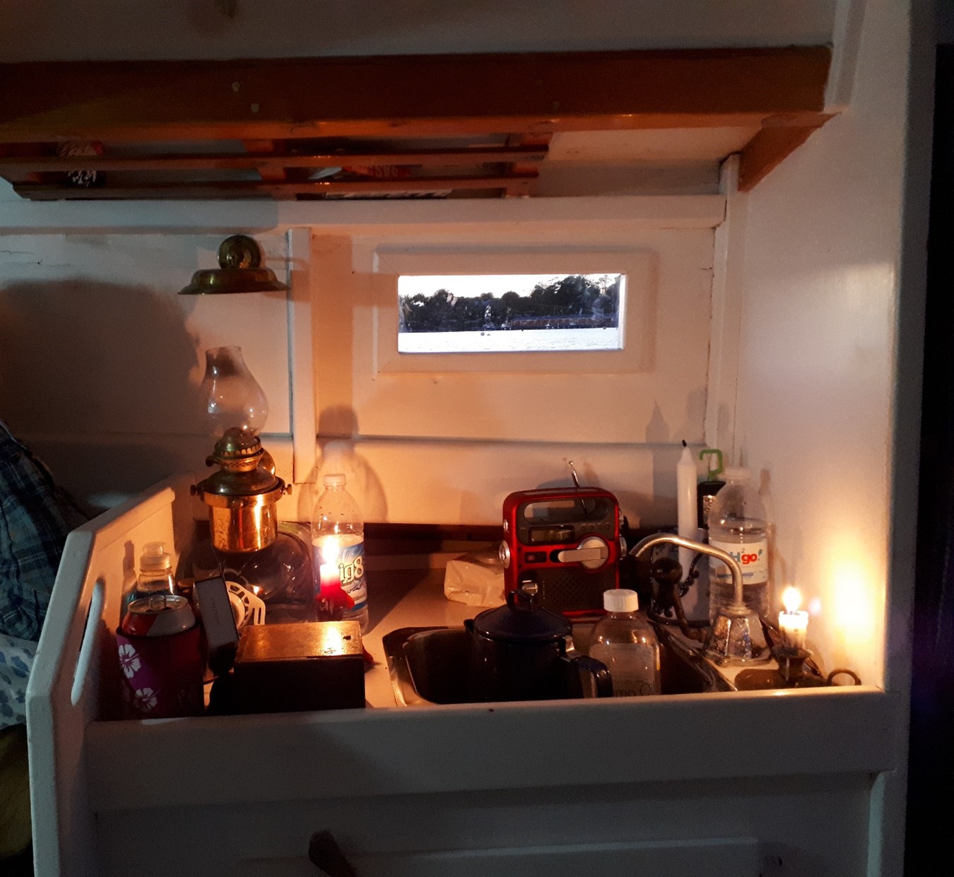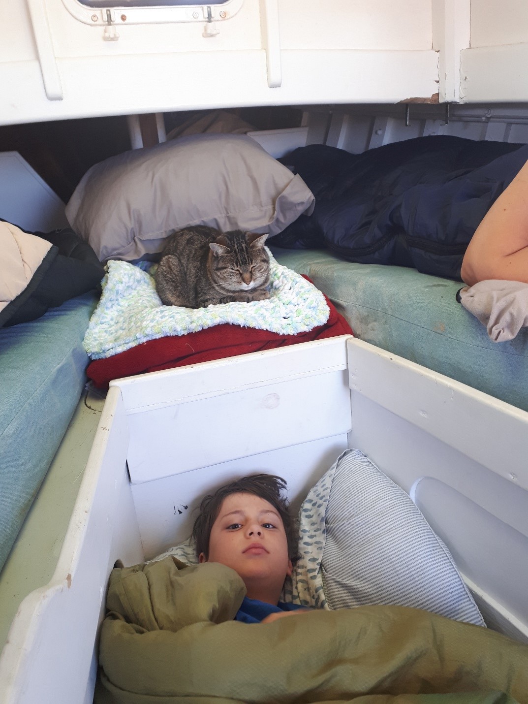 At anchor after the sail. Cat and boy all snug in “bunk sweet bunk”.